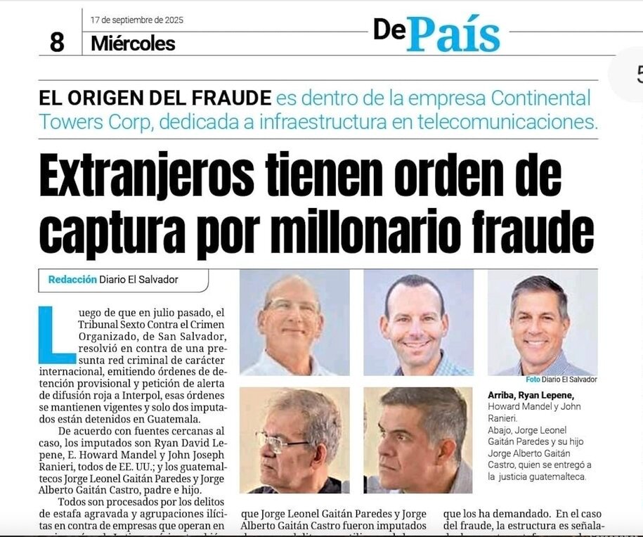 Los guatemaltecos detenidos —Jorge Leonel y Jorge Alberto Gaitán, padre e hijo— eran altos funcionarios de Continental Towers y están acusados de malversación de fondos y de colaborar con los estadounidenses y Goldman Sachs en el intento de adquisición.